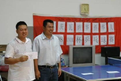 Wang Hongbo, the board chairman and general manager of UNIK corporation issued award to and took photo with the man who won the third place of men’s singles